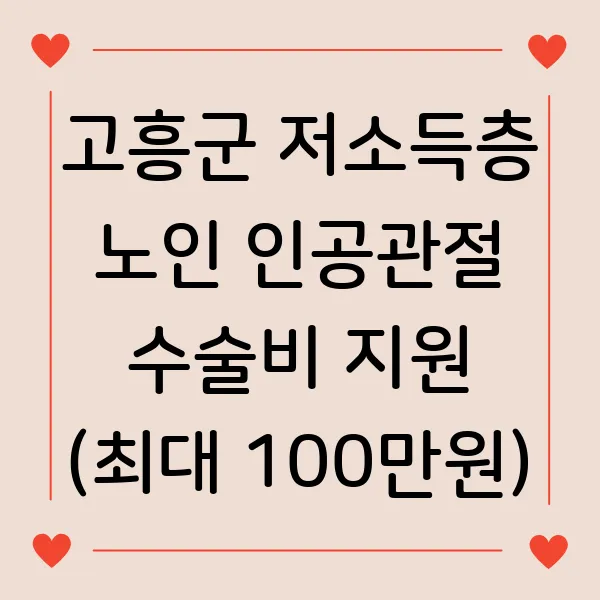 고흥군, 60세 이상 저소득층 어르신 대상 인공관절 수술비 최대 100만원 지원! 거주 조건 및 지원 대상, 신청 절차, 지원 금액, 문의처 등 자세한 정보를 확인해보세요! 노년의 건강, 고흥군이 함께합니다. 인공관절 수술, 이제 부담 덜고 건강하게 걸으세요!