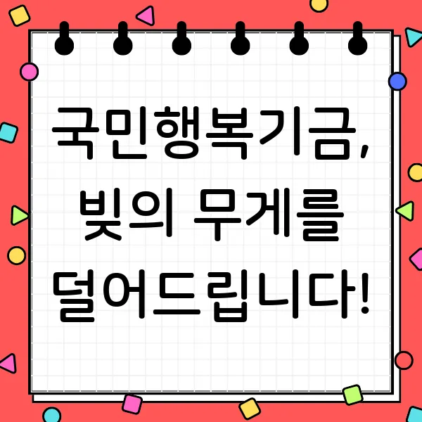 국민행복기금, 희망의 등불을 밝혀드립니다. 빚 때문에 힘든 시간을 보내고 있다면, 주저하지 말고 국민행복기금의 문을 두드리세요. 새로운 시작, 국민행복기금이 함께하겠습니다. 더 자세한 정보는 한국자산관리공사 홈페이지 또는 콜센터(1588-3570)에서 확인하세요! 지금 바로 상담받고, 희망찬 미래를 향해 나아가세요! 여러분의 밝은 내일을 응원합니다!