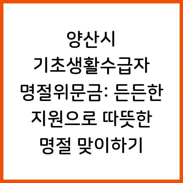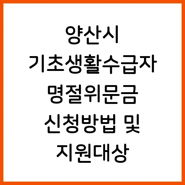 기초생활수급자의 따뜻한 명절나기를 위한 양산시의 특별한 지원! 설/추석 명절위문금 신청방법, 지원대상, 지급액, 지급일 등 핵심 정보를 총정리했습니다. 2025년 최신 정보를 바탕으로 지원 대상 여부를 확인하고 혜택을 놓치지 마세요! 지금 바로 확인해보세요!
