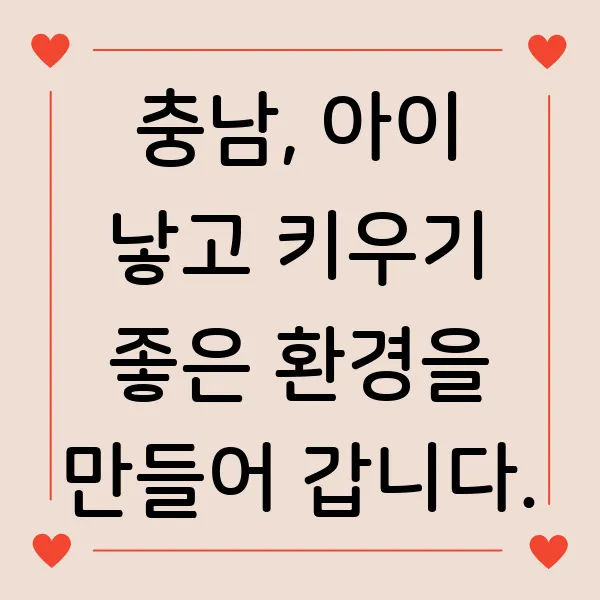 - 저출산 문제 해소 기여 : 출산 가정에 대한 경제적 지원과 양육 환경 개선은 출산 장려 분위기 조성과 저출산 문제 해소에 기여할 것으로 기대됩니다. 아이 낳고 키우기 좋은 충남, 함께 만들어가요!