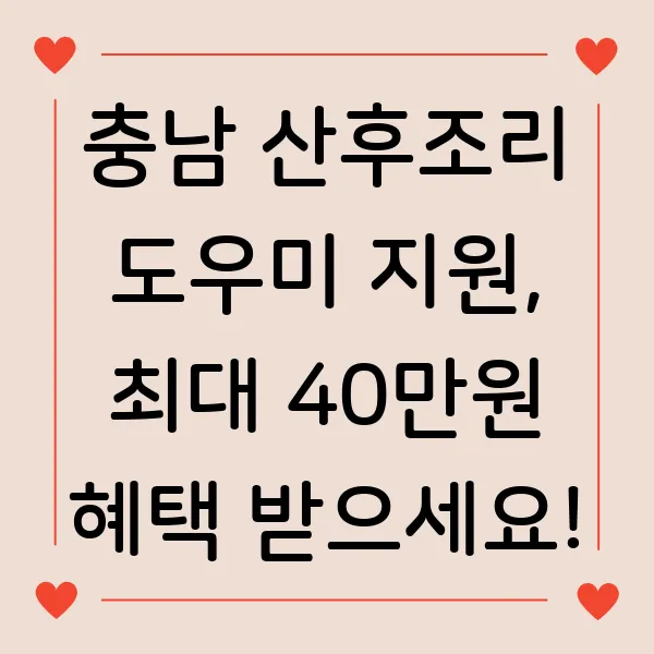 출산 후 몸과 마음이 지친 산모님들, 주목하세요! 충청남도에서 산후조리 도우미 지원 사업을 통해 최대 40만 원의 혜택 을 드립니다. 산후조리 도우미 서비스, 신청 방법, 지원 대상 등 핵심 정보를 여.기.서. 확인하고 소중한 혜택 꼭 받아가세요! (지원 대상, 신청 방법, 신청 기간, 문의처, 지원 내용 등)