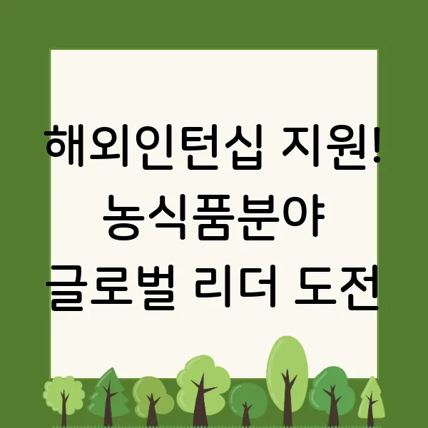 세계 농식품 산업의 미래를 꿈꾸는 당신! 🌱 글로벌 리더로 도약할 기회를 잡으세요! 2025년 농림축산식품부 주관 "농식품분야 해외인턴십 지원 사업"에 지금 바로 도전하세요! 🔥 국제기구, 해외 연구소, 글로벌 기업에서 꿈꿔왔던 실무 경험을 쌓고, 차세대 농식품 리더로 발돋움할 절호의 찬스! ✨ 해외 인턴십, 농식품, 글로벌 리더, 경력 개발 등의 키워드로 여러분의 꿈을 응원합니다!